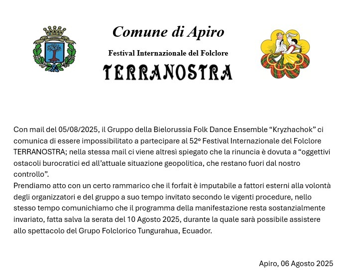 Il Festival Internazionale “Terranostra”, organizzato con cura e passione dal Comune di Apiro e dall’associazione culturale e folcloristica “Urbanitas”, è uno dei più antichi e importanti festival folcloristici d’Italia.